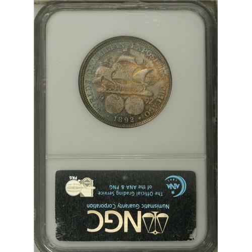 <B>1892 50C Columbian MS67 NGC.</B></I> Ex: Richard Jewell Collection. This is a splendidly preserved Columbian Exposition half that is attractively toned in turquoise-blue and reddish-gold on each side. The quality and originality of this piece is nearly unsurpassable. Population: 32 in 67, 1 finer (11/06).<BR><BR><b>Shipping:</b> Coin/Currency (<a target="_blank" href="http://www.heritageauctions.com/common/shipping.php">view shipping information</a>)