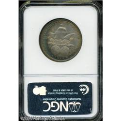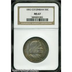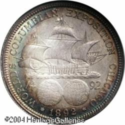 1892 50C Columbian MS67 NGC. The overall appearanc <B>1892 50C Columbian MS67 NGC.</B></I> The overall appearance of this boldly struck near-Gem is greatly enhanced by strong, full luster, lovely electric-blue, crimson, and apricot iridescence, near the borders, and excellent surface preservation. A well kept and attractive Superb Gem. Population: 22 in 67, 1 finer (10/04). <BR><BR><B>Important notice:</B> Heritage usually auctions material at the rate of 200-250 lots per hour. On some occasions eBay Live bid software or the Internet may not be able to keep up with the pace of the auction. We recommend placing a realistic absentee bid now as insurance to avoid disappointment. Occasionally the auctioneer may eliminate or reject an eBay Live bid, and the auctioneer may also reopen a lot after the close of the eBay live bidding (usually because we missed an audience bid), and may reject your bid even if it shows you as the winning bidder. By bidding via eBay Live, you agree that Heritage may award the lot to another bidder at its sole discretion under the circumstances described above or any other reasonable circumstances. Since eBay bids are not shown to us until we open the lot on the floor, we treat those bids just like floor bids. In most cases the floor responds before the eBay bid is presented to us, due to Internet lag time, so for consistency we have made it a policy that floor bids are always considered first over tie eBay live bids. Also please note that all Heritage lots purchased through eBay Live carry a 20% Buyer's Premium. Please make sure you read the Terms and Conditions before you bid. This lot is being auctioned in conjunction with a live floor auction by Heritage Galleries & Auctioneers. All final auction and invoice information will be supplied by Heritage Galleries & Auctioneers, and all other information should be considered preliminary. Lot:7881
