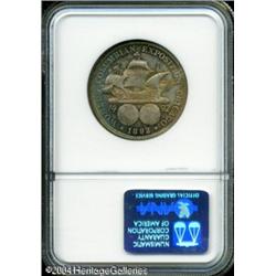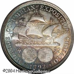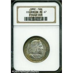 1892 50C Columbian MS67 NGC. This is an amazingly <B>1892 50C Columbian MS67 NGC.</B></I> This is an amazingly well preserved Columbian Exposition Half Dollar that is attractively toned in turquoise-blue and reddish-gold on each side. The quality and originality of this piece is nearly unsurpassable. Population: 22 in 67, 1 finer (10/04). <BR><BR><B>Important notice:</B> Heritage usually auctions material at the rate of 200-250 lots per hour. On some occasions eBay Live bid software or the Internet may not be able to keep up with the pace of the auction. We recommend placing a realistic absentee bid now as insurance to avoid disappointment. Occasionally the auctioneer may eliminate or reject an eBay Live bid, and the auctioneer may also reopen a lot after the close of the eBay live bidding (usually because we missed an audience bid), and may reject your bid even if it shows you as the winning bidder. By bidding via eBay Live, you agree that Heritage may award the lot to another bidder at its sole discretion under the circumstances described above or any other reasonable circumstances. Since eBay bids are not shown to us until we open the lot on the floor, we treat those bids just like floor bids. In most cases the floor responds before the eBay bid is presented to us, due to Internet lag time, so for consistency we have made it a policy that floor bids are always considered first over tie eBay live bids. Also please note that all Heritage lots purchased through eBay Live carry a 20% Buyer's Premium. Please make sure you read the Terms and Conditions before you bid. This lot is being auctioned in conjunction with a live floor auction by Heritage Galleries & Auctioneers. All final auction and invoice information will be supplied by Heritage Galleries & Auctioneers, and all other information should be considered preliminary. Lot:7882