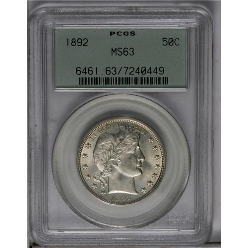 <B>1892<50C> MS63 PCGS.</B></I> A lustrous and lightly toned Barber type coin. Sharply struck, and the reverse is splendidly smooth. An obscure pinscratch is near the rim above obverse star 7. IN GOD WE TRUST is lightly but multiply die doubled toward the rim. Housed in a green label holder.<BR><I>From The Royal Oak Collection.</B></I>