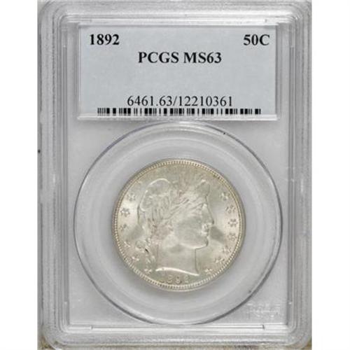 <B>1892 50C MS63 PCGS.</B></I> . PCGS Population (163/351). NGC Census: (142/283). Mintage: 934,000. Numismedia Wsl. Price for NGC/PCGS coin in MS63: $700. (#6461)<BR><BR><B>Coin Engraver:</B> Charles E. Barber<BR><BR><b>Shipping:</b> Coins & Currency (<a target="_blank" href="http://www.heritageauctions.com/common/shipping.php">view shipping information</a>)