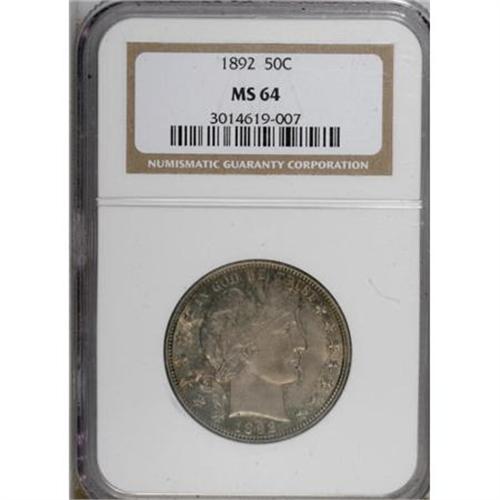 <B>1892 50C MS64 NGC.</B></I> Fully struck in all areas. The softly frosted mint luster is covered with several layers of gray, olive, and pinkish-rose toning.<BR><BR><B>Coin Engraver:</B> Charles E. Barber<BR><BR><b>Shipping:</b> Coins & Currency (<a target="_blank" href="http://www.heritageauctions.com/common/shipping.php">view shipping information</a>)