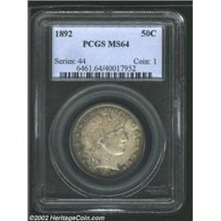 1892 50C MS64 PCGS. The obverse has blushes of sea-green and lavender patina, while the reverse has.