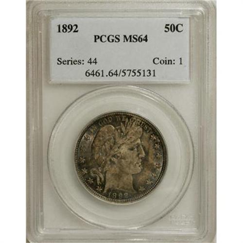 <B>1892 50C MS64 PCGS.</B></I> PCGS Population (187/146). NGC Census: (158/125). Mintage: 934,000. Numismedia Wsl. Price for NGC/PCGS coin in MS64: $1,050. (#6461)<BR><BR><B>Coin Engraver:</B> Charles E. Barber<BR><BR><b>Shipping:</b> Coins & Currency (<a target="_blank" href="http://www.heritageauctions.com/common/shipping.php">view shipping information</a>\)