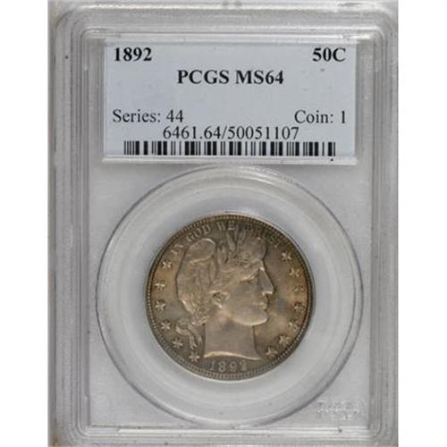 <B>1892 50C MS64 PCGS.</B></I> Elegant gold-orange and olive patina drapes the lustrous surfaces of this first-year Barber half. Solidly struck with a handful of scattered marks along Liberty's jawline.<BR><BR><B>Coin Engraver:</B> Charles E. Barber<BR><BR><b>Shipping:</b> Coins & Currency (<a target="_blank" href="http://www.heritageauctions.com/common/shipping.php">view shipping information</a>)