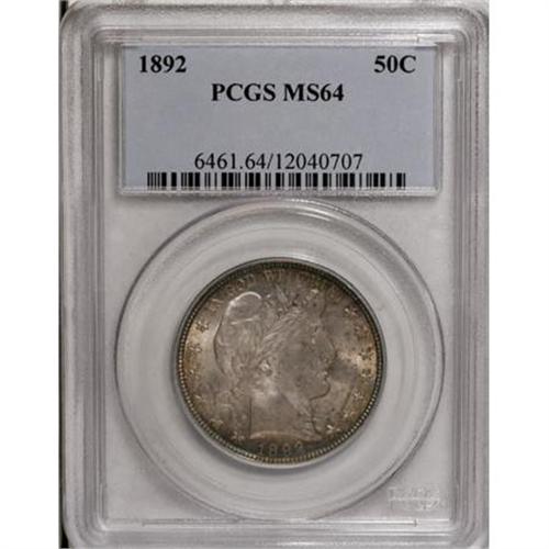 <B>1892 50C MS64 PCGS.</B></I> Both sides of this first-year half show rich patina over strongly lustrous and well-preserved surfaces. Silver-gray centers give way to sapphire, tan-gold, orange, and rouge elements at the margins.<BR><BR><B>Coin Engraver:</B> Charles E. Barber<BR><BR><b>Shipping:</b> Coins & Currency (<a target="_blank" href="http://www.heritageauctions.com/common/shipping.php">view shipping information</a>)