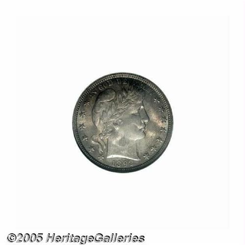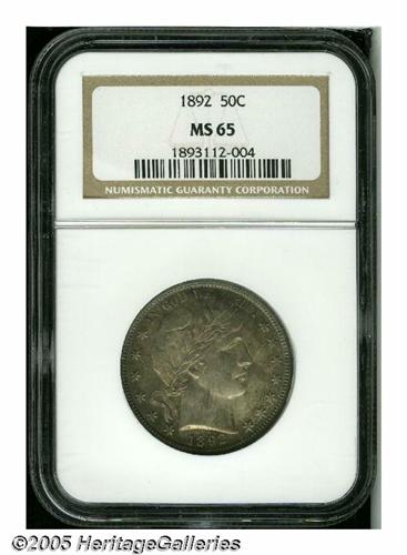 <B>1892<50C> MS65 NGC.</B></I> A layer of pewter-gray toning blankets each side of this lustrous Gem, with hints of golden-brown and brick-red undertones evident when one rotates the coin beneath a light. A nice original Gem example of this premier Barber Half issue, an excellent choice for a high grade type or date set.