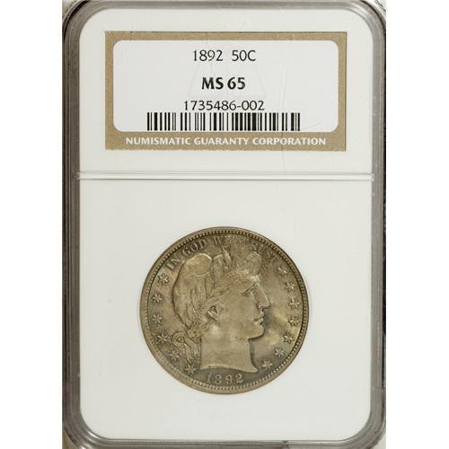 <B>1892 50C MS65 NGC.</B></I> Fabulous luster radiates from surfaces toned in light to medium silver-gray and cobalt-blue. An exquisite strike imparts sharp definition to the design elements, save for minor softness in the upper right part of the shield, a typical characteristic of this issue. Some unobtrusive obverse marks prevent this lovely piece from attaining an even finer grade. Census: 79 in 65, 46 finer (4/07).<BR><BR><b>Shipping:</b> Coins & Currency (<a target="_blank" href="http://www.heritageauctions.com/common/shipping.php">view shipping information</a>)