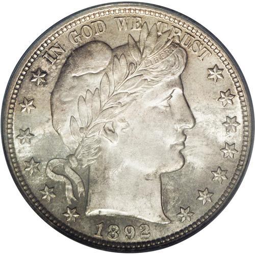 <B>1892<50C> MS65 PCGS.</B></I> This first-year-of-issue representative displays sharply struck design elements and splotches of light gray color that overlay highly lustrous surfaces. A few minute marks on Liberty's cheek and neck are mentioned solely for accuracy. Many of the 934,000 pieces struck at the Philadelphia Mint were saved as the first of their kind. Population: 77 in 65, 48 finer (3/06).