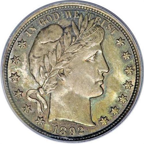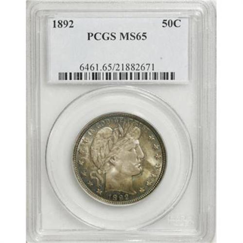 <B>1892 50C MS65 PCGS.</B></I> The first year of issue for the design created by Charles Barber, and highly sought by both date and type collectors. An exquisite and frosty Gem with gold, steel, and light brown toning on each side. Design elements on both sides are sharply defined, from freshly created hubs and dies. PCGS has only graded 56 finer pieces.<BR><BR><B>Coin Engraver:</B> Charles E. Barber<BR><BR><b>Shipping:</b> Coins & Currency (<a target="_blank" href="http://www.heritageauctions.com/common/shipping.php">view shipping information</a>)