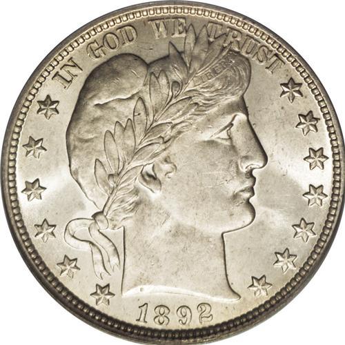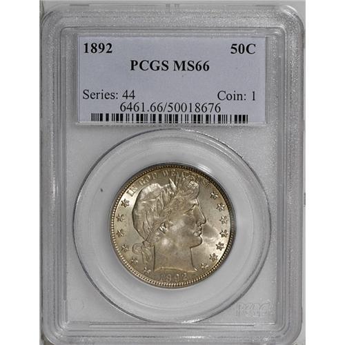 <B>1892<50C> MS66 PCGS.</B></I> More than 8 million 1892 quarters were struck, but the mintage of the Barber half dollar was less than 1 million pieces. Perhaps the reason for the lower production was the Columbian Exposition halves, which also had a new mintage of just under 1 million pieces. After generations of Seated Liberty dates, the public must have been surprised by the new circulating designs, since 1892 halves of both types were set aside. At the MS66 level, however, the 1892 emerges as a rarity, and is also important as a type coin. This highly lustrous Premium Gem has light chestnut toning and a penetrating strike. The fletchings and shield corners are needle-sharp, and the fields are immaculate. Trivial ticks near the mouth are barely worthy of mention. This formidable first-year example would be a standout contribution to a high quality type set. Population: 36 in 66, 11 finer (6/06).
