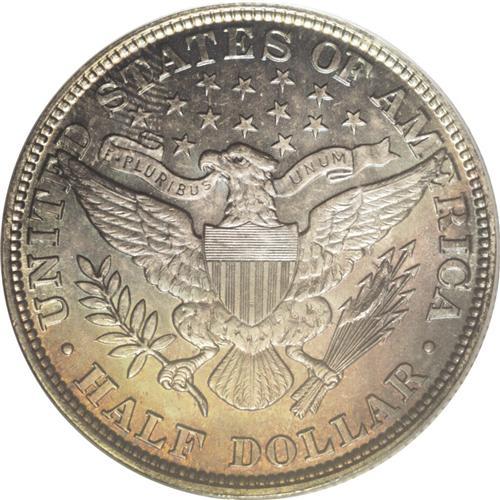 <B>1892<50C> MS67 PCGS.</B></I> As the first year of issue, the 1892 Barber coinage was saved in significant numbers by many Americans who had never seen another silver coinage design than the 1837-91 Seated Liberty pieces. Although the mintage of 934,000 pieces was modest by P-mint standards, examples are available in all grades, up to and including MS67. This Superb Gem example boasts spectacularly toned surfaces in shades of gold, amber, copper, green, and lilac. The strike is bold, with just a hint of softness on the right (facing) shield corner and sharp impressions elsewhere. A large die crack or retained internal cud is noted through the top arrow shafts and the lower portion of the eagle's wing. Population: 10 in 67, 1 finer (7/06).