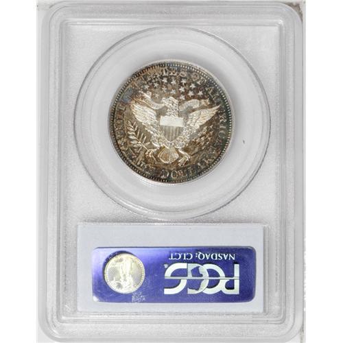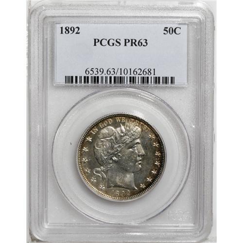 <B>1892<50C> PR63 PCGS.</B></I> All of the design features are fully delineated on this attractive proof specimen. Gorgeous red-brown and cobalt-blue peripheral toning appears on each side. A few wispy contact marks and slide marks on Liberty's portrait reduce the grade.