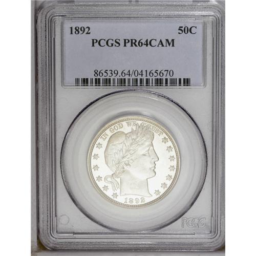 <B>1892<50C> PR64 Cameo PCGS.</B></I> A stunning beauty with rich and frosty luster on the central obverse and reverse motifs, surrounded by excellent proof surfaces in the fields. A few wispy hairlines on Liberty's cheek are all that keep this near-Gem from a higher grade. Even at this grade level, the population is rather limited. Population: 14 in 64 Cameo, 23 finer (2/06).