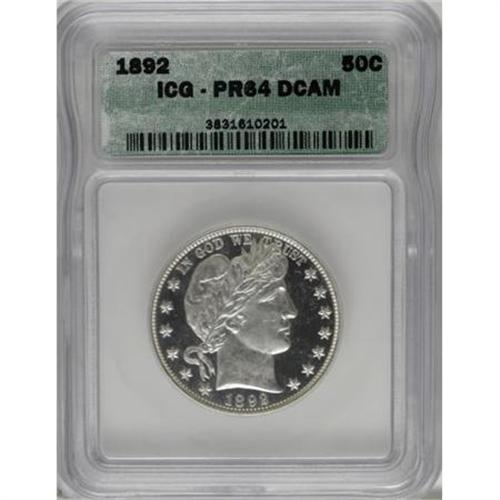 <B>1892 50C PR64 Deep Cameo ICG.</B></I> Tremendous contrast between the white devices and the heavily mirrored fields is immediately evident, leaving no doubt as to this coin's status as a Deep Cameo. The barest trace of golden-brown color can be detected on some of Liberty's higher points. A mark on Liberty's cheek below the nose limits the grade.<BR><BR><b>Shipping:</b> Coins & Currency (<a target="_blank" href="http://www.heritageauctions.com/common/shipping.php">view shipping information</a>)