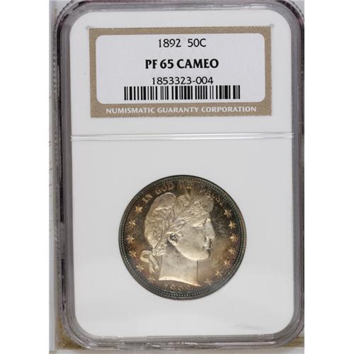<B>1892 50C PR65 Cameo NGC.</B></I> Strong field-design contrast is apparent on his sharply struck 1892 proof half. Whispers of cobalt-blue, lavender, and golden-tan color gravitate to the peripheries, especially on the obverse, where moderate roller marks reside. Light doubling is seen on some of the reverse lettering, especially HALF DOLLAR. Census: 18 in 65 Cameo, 42 finer (11/06).<BR><BR><b>Shipping:</b> Coin/Currency (<a target="_blank" href="http://www.heritageauctions.com/common/shipping.php">view shipping information</a>)