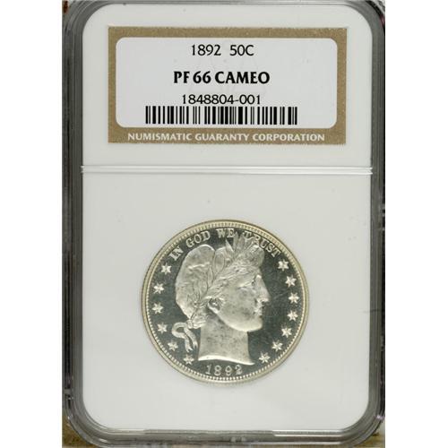 <B>1892 50C PR66 Cameo NGC.</B></I> A brilliant and precisely struck Premium Gem that possesses undeniable eye appeal. Frosty devices contrast nicely with the smooth, glass-like fields. HALF DOLLAR and AMERICA exhibit die doubling, one of several doubled die varieties from the various 1892-dated Barber issues. Census: 20 in 66 Cameo, 22 finer (1/07).<BR><BR><b>Shipping:</b> Coins & Currency (<a target="_blank" href="http://www.heritageauctions.com/common/shipping.php">view shipping information</a>)