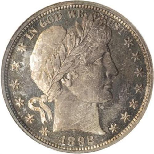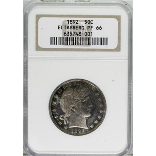 <B>1892 50C PR66 NGC.</B></I> Ex: Eliasberg. The stunning overall quality of this first-year specimen is readily apparent at first glance. Fully struck throughout and contact-free, the nearly pristine surfaces display highly reflective fields and rich, dappled coloration on both sides. An impressive pedigree further recommends this Premium Gem to the serious collector of proof Barber halves.<BR><I>Ex: Louis E. Eliasberg, Sr., Collection (Bowers and Merena, 4/97), lot 2063, which realized $7,150.</B></I><BR><BR><B>Coin Engraver:</B> Charles E. Barber<BR><BR><b>Shipping:</b> Coins & Currency (<a target="_blank" href="http://www.heritageauctions.com/common/shipping.php">view shipping information</a>\)