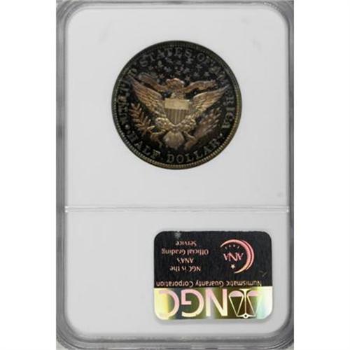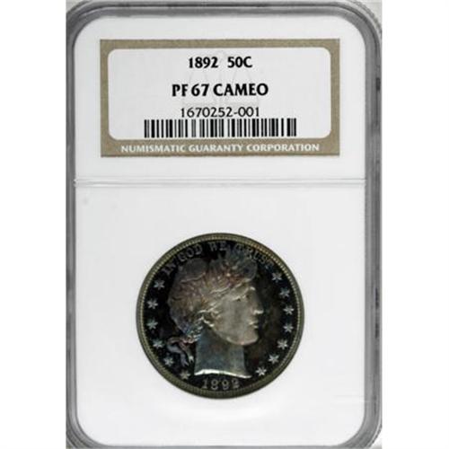 <B>1892 50C PR67 Cameo NGC.</B></I> Splashes of sky-blue, violet, and mauve toning cover the obverse, while golden-orange dominates the central reverse, flanked by sky-blue and purple at the margins. The design elements are well brought up, save for the usual softness in the upper right corner of the shield, and establish strong contrast with the reflective fields. Nicely preserved throughout. Census: 23 in 67 Cameo, 2 finer (11/07).<BR><BR><b>Shipping:</b> Coins & Currency (<a target="_blank" href="http://www.heritageauctions.com/common/shipping.php">view shipping information</a>)