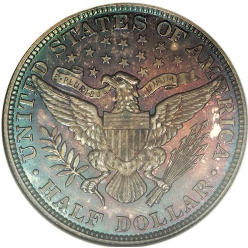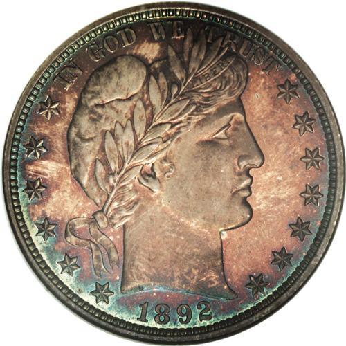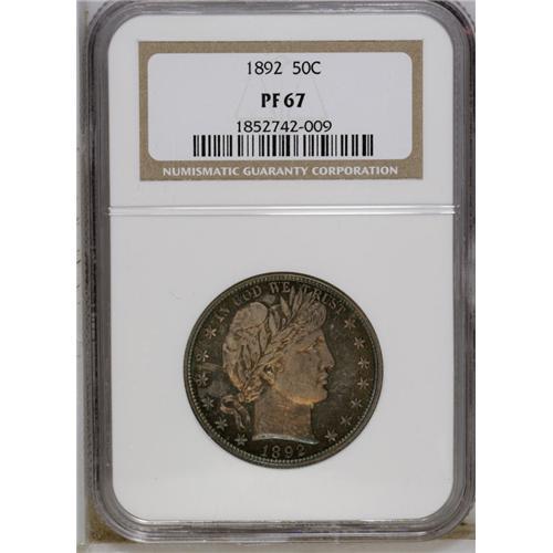 <B>1892 50C PR67 NGC.</B></I> The golden-brown obverse field frames the orange-gray portrait, and in turn bounded by rose and aquamarine patina. Ocean-blue and ruby-red patina embraces the reverse. A crisply struck and radiant first-year Superb Gem. The reverse is lightly die doubled, particularly on the peripheral legends. Census: 20 in 67, 3 finer (10/06).<BR><BR><b>Shipping:</b> Coin/Currency (<a target="_blank" href="http://www.heritageauctions.com/common/shipping.php">view shipping information</a>)
