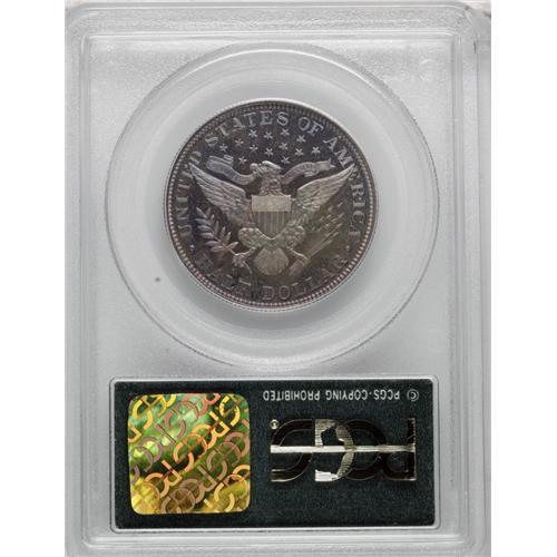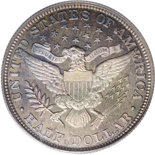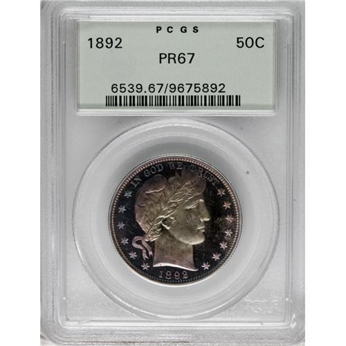<B>1892 50C PR67 PCGS.</B></I> Extraordinary fuchsia toning near the margins cedes to mint-green in the centers on each side, without dimming the fantastic luster. The strike is equally sharp. Type set collectors seeking a truly standout example of this first-year example need search no further. One of the considerable proof mintage of 1,245 pieces, this piece's grade is exceeded by only four examples at PCGS and three at NGC (4/07). Certified in a green-label holder.<BR><BR><b>Shipping:</b> Coins & Currency (<a target="_blank" href="http://www.heritageauctions.com/common/shipping.php">view shipping information</a>)