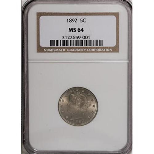 <B>1892 5C MS64 NGC.</B></I> . NGC Census: (120/81). PCGS Population (167/115). Mintage: 11,699,642. Numismedia Wsl. Price for NGC/PCGS coin in MS64: $280. (#3853)<BR><BR><B>Coin Engraver:</B> Charles E. Barber<BR><BR><b>Shipping:</b> Coins & Currency (<a target="_blank" href="http://www.heritageauctions.com/common/shipping.php">view shipping information</a>)