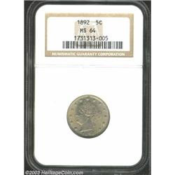 <TABLE cellSpacing=0 cellPadding=0 width="100%" bgColor=#000000 border=0><TBODY><TR><TD width="100%"><TABLE cellSpacing=1 cellPadding=3 width="100%" border=0><TBODY><TR><TD width="100%" bgColor=#79735c><FONT face=arial color=#ffffff size=3><B>Description</B> </FONT></TD></TR><TR><TD width="100%" bgColor=#ffffff><FONT face=arial size=2><B>1892 5C MS64 NGC.</B></I> Exceptionally well struck, indeed very close to fully defined, with overlays of milky apricot patina over satiny surfaces. </FONT></TD></TR></TBODY></TABLE></TD></TR></TBODY></TABLE><BR><A name=PricesRealized></A><TABLE cellSpacing=0 cellPadding=0 width="100%" bgColor=#000000 border=0><TBODY><TR><TD width="100%"><TABLE cellSpacing=1 cellPadding=3 width="100%" border=0><TBODY><TR><TD width="100%" bgColor=#79735c><A name=PR><FONT face=arial color=#ffffff size=3><B>Previous Prices from Heritage Auctions</B> </FONT></A></TD></TR><TR><TD bgColor=#f6f6ed><TABLE cellSpacing=0 cellPadding=0 width="100%" border=1><TBODY><TR><TD align=middle width="33%"><B>Date</B></TD><TD align=middle width="33%"><B>Service</B></TD><TD align=middle width="33%"><B>Price</B></TD></TR><TR bgColor=whitesmoke><TD width="33%"><B>04/28/2002</B></TD><TD width="33%">PCGS</TD><TD width="33%">$207.00</TD></TR><TR bgColor=whitesmoke><TD width="33%"><B>02/22/1997</B></TD><TD width="33%">PCGS</TD><TD width="33%">$286.00</TD></TR><TR bgColor=whitesmoke><TD width="33%"><B>04/24/2001</B></TD><TD width="33%">NGC</TD><TD width="33%">$160.00</TD></TR><TR bgColor=whitesmoke><TD width="33%"><B>03/04/2003</B></TD><TD width="33%">NGC</TD><TD width="33%">$166.75</TD></TR></TBODY></TABLE></TD></TR><TR><TD bgColor=#ffffff><FONT face=arial size=1 ?>PLEASE NOTE: All prices realized reflect the final hammer price PLUS the buyer's premium in auctions that charge a buyer's premium. Each item has a notation at the top of the listing indicating whether that lot included a buyer's premium. Example: A item that sells with a final hammer price of $100 and a 20% buyer's premium will display with a price realized of $120. All information listed is intended to be as accurate as possible, but errors are possible. Please use this guide carefully and inform us of any inaccuracies. </FONT></TD></TR></TBODY></TABLE></TD></TR></TBODY></TABLE><BR><TABLE cellSpacing=0 cellPadding=0 width="100%" bgColor=#000000 border=0><TBODY><TR><TD width="100%"><TABLE cellSpacing=1 cellPadding=3 width="100%" border=0><TBODY><TR><TD width="100%" bgColor=#79735c colSpan=6><FONT face=arial color=#ffffff size=3><B>Price Guide*</B> </FONT></TD></TR><TR bgColor=#f6f6ed><TD align=middle><B>Grade</B> </TD><TD align=middle><B>Coin World<BR>(Trends)</B> </TD><TD align=middle><B>Numismedia<BR>Retail</B> </TD><TD align=middle><B>Numismedia<BR>Wholesale</B> </TD><TD align=middle><B>Coin<BR>Universe</B> </TD><TD align=middle><B>Heritage<BR>Value Index</B> </TD></TR><TR bgColor=#ffffff><TD align=middle>63</TD><TD align=right>$155.00</TD><TD align=right>$156.00</TD><TD align=right>$130.00</TD><TD align=right>$150.00</TD><TD align=right>$112.23</TD></TR><TR style="FONT-WEIGHT: bold" bgColor=#cccfdd><TD align=middle>64</TD><TD align=right>$275.00</TD><TD align=right>$290.00</TD><TD align=right>$232.00</TD><TD align=right>$185.00</TD><TD align=right>$155.00</TD></TR><TR bgColor=#ffffff><TD align=middle>65</TD><TD align=right>$1,375.00</TD><TD align=right>---</TD><TD align=right>$900.00</TD><TD align=right>$1,375.00</TD><TD align=right>$916.94</TD></TR><TR bgColor=#ffffff><TD colSpan=6><FONT size=1>*All information listed is intended to be as accurate as possible, but errors are possible. No item may be returned or refused based on this information which is provided as a service to our customers. You should contact each pricing source directly to determine the accuracy of this information. </FONT></TD></TR></TBODY></TABLE></TD></TR></TBODY></TABLE><BR><TABLE cellSpacing=0 cellPadding=0 width="100%" bgColor=#000000 border=0><TBODY><TR><TD width="100%"><TABLE cellSpacing=1 cellPadding=3 width="100%" border=0><TBODY><TR><TD width="100%" bgColor=#79735c><FONT face=arial color=#ffffff size=3><B>Population Guide</B> </FONT></TD></TR><TR bgColor=#ffffff><TD align=middle><!-- Begin Output of Population Grid--><TABLE cellSpacing=0 cellPadding=0 width="100%" border=0><TBODY><TR><TD vAlign=center><TABLE cellSpacing=0 width="100%" border=1 cellsadding="3"><TBODY><TR><TD vAlign=center><TABLE cellSpacing=0 cellPadding=3 width="100%" border=1><TBODY><TR><TD vAlign=center align=middle bgColor=#f0f1e8 colSpan=2 <CENTER><FONT face=Arial size=2><B>PCGS Pop </B></FONT><CENTER></CENTER></TD><TD vAlign=center align=middle bgColor=#f0f1e8 colSpan=2><CENTER><FONT face=Arial size=2><B>NGC Pop</B></CENTER></FONT></TD></TR><TR><TD vAlign=center><FONT face=Arial size=2>(64)</FONT> </TD><TD vAlign=center align=right><FONT face=Arial size=2>114</FONT> </TD><TD vAlign=center><FONT face=Arial size=2>(64)</FONT> </TD><TD vAlign=center align=right><FONT face=Arial size=2>90</FONT> </TD></TR><TR><TD vAlign=center><FONT face=Arial size=2>(>64)</FONT> </TD><TD vAlign=center align=right><FONT face=Arial size=2>35</FONT> </TD><TD vAlign=center><FONT face=Arial size=2>(>64)</FONT> </TD><TD vAlign=center align=right><FONT face=Arial size=2>65</FONT> </TD></TR></TBODY></TABLE></TD></TR></TBODY></TABLE></TD></TR></TBODY></TABLE><!-- End Output of Population Grid--> Important notice: Heritage usually auctions material at the rate of 200-250 lots per hour. On some occasions eBay Live bid software or the Internet may not be able to keep up with the pace of the auction. We recommend placing a realistic absentee bid now as insurance to avoid disappointment. Occasionally the auctioneer may eliminate or reject an eBay Live bid, and the auctioneer may also reopen a lot after the close of the eBay live bidding (usually because we missed an audience bid), and may reject your bid even if it shows you as the winning bidder. By bidding via eBay Live, you agree that Heritage may award the lo