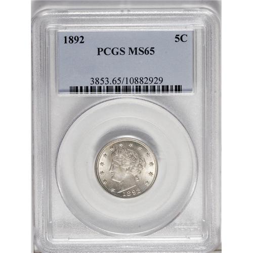 <B>1892 5C MS65 PCGS.</B></I> Highly lustrous beneath lovely rose and orange patina. Crisply struck overall with some light marks within the wreath. Population: 64 in 65, 12 finer (10/06).<BR><BR><b>Shipping:</b> Coin/Currency (<a target="_blank" href="http://www.heritageauctions.com/common/shipping.php">view shipping information</a>)