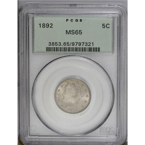 1892 5C MS65 PCGS. Sharply struck, the satiny surfaces