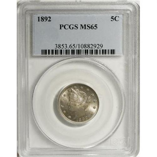 <B>1892 5C MS65 PCGS.</B></I> This delightful Liberty Gem shows soft luster beneath lovely rose and orange patina. Crisply struck overall with excellent eye appeal for this earlier issue. PCGS has graded 13 pieces finer (8/07).<BR><BR><B>Coin Engraver:</B> Charles E. Barber<BR><BR><b>Shipping:</b> Coins & Currency (<a target="_blank" href="http://www.heritageauctions.com/common/shipping.php">view shipping information</a>)