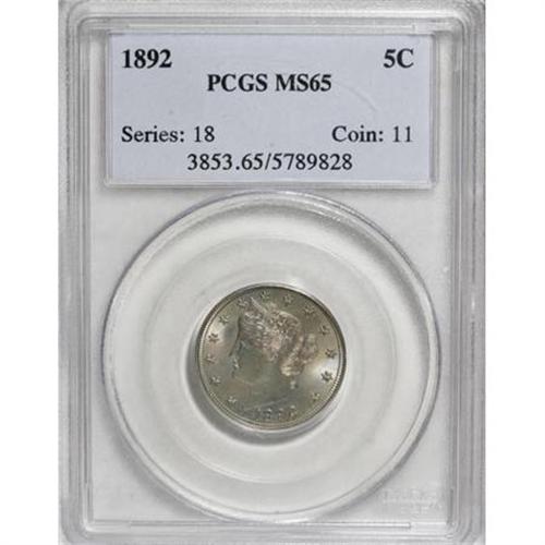 <B>1892 5C MS65 PCGS.</B></I> Elements of mustard-gold and nickel-blue patina grace each side; the former is more prominent on the reverse, while the latter covers most of the obverse. A well struck and appealing Gem. PCGS has certified 13 finer pieces (1/08).<BR><BR><B>Coin Engraver:</B> Charles E. Barber<BR><BR><b>Shipping:</b> Coins & Currency (<a target="_blank" href="http://www.heritageauctions.com/common/shipping.php">view shipping information</a>)