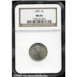 <B>1892<5C> MS66 NGC.</B></I> Bright honey-gold surfaces with a few faint apricot streaks on each side, and great radiant luster, with no apparent marks or blemishes to be seen. Slight weakness is noted on some of the obverse peripheral stars and on the reverse left ear of corn. Still, a lovely and nearly unimprovable premium Gem. Population: 5 in 66, 0 finer (6/04). <BR><BR><B>Important notice:</B> Heritage usually auctions material at the rate of 200-250 lots per hour. On some occasions eBay Live bid software or the Internet may not be able to keep up with the pace of the auction. We recommend placing a realistic absentee bid now as insurance to avoid disappointment. Occasionally the auctioneer may eliminate or reject an eBay Live bid, and the auctioneer may also reopen a lot after the close of the eBay live bidding (usually because we missed an audience bid), and may reject your bid even if it shows you as the winning bidder. By bidding via eBay Live, you agree that Heritage may award the lot to another bidder at its sole discretion under the circumstances described above or any other reasonable circumstances. Since eBay bids are not shown to us until we open the lot on the floor, we treat those bids just like floor bids. In most cases the floor responds before the eBay bid is presented to us, due to Internet lag time, so for consistency we have made it a policy that floor bids are always considered first over tie eBay live bids. Also please note that all Heritage lots purchased through eBay Live carry a 20% Buyer's Premium. Please make sure you read the Terms and Conditions before you bid. </span></font></tr></table></td></tr></table>
