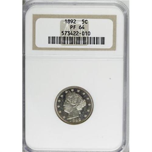 <B>1892 5C PR64 NGC.</B></I> NGC Census: (122/155). PCGS Population (217/135). Mintage: 2,745. Numismedia Wsl. Price for NGC/PCGS coin in PR64: $232. (#3890)<BR><BR><B>Coin Engraver:</B> Charles E. Barber<BR><BR><b>Shipping:</b> Coins & Currency (<a target="_blank" href="http://www.heritageauctions.com/common/shipping.php">view shipping information</a>\)