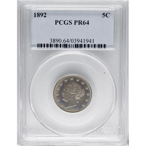 <B>1892 5C PR64 PCGS.</B></I> PCGS Population (215/135). NGC Census: (242/308). Mintage: 2,745. Numismedia Wsl. Price for NGC/PCGS coin in PR64: $232. (#3890)<BR><BR><b>Shipping:</b> Coins & Currency (<a target="_blank" href="http://www.heritageauctions.com/common/shipping.php">view shipping information</a>)