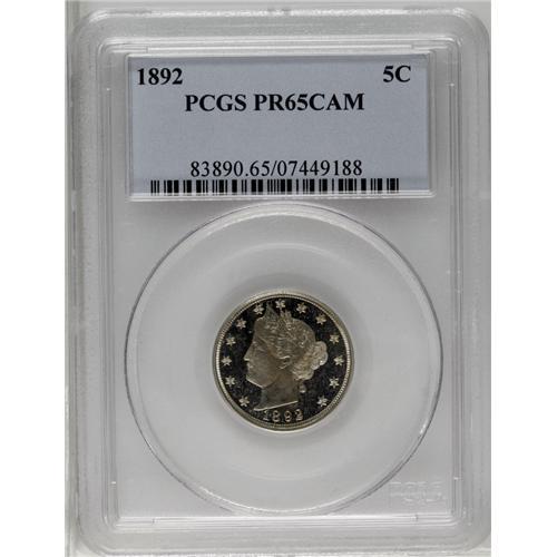 <B>1892<5C> PR65 Cameo PCGS.</B></I> Blushes of medium golden-brown patination add to the charm of this meticulously struck and flashy Gem. The top of the 1 and the base of the 2 are lightly repunched. Population: 11 in 65 Cameo, 13 finer (3/06). <BR><BR><B>Important notice:</B> Heritage usually auctions material at the rate of 200-250 lots per hour. On some occasions eBay Live bid software or the Internet may not be able to keep up with the pace of the auction. We recommend placing a realistic absentee bid now as insurance to avoid disappointment. Occasionally the auctioneer may eliminate or reject an eBay Live bid, and the auctioneer may also reopen a lot after the close of the eBay live bidding (usually because we missed an audience bid), and may reject your bid even if it shows you as the winning bidder. By bidding via eBay Live, you agree that Heritage may award the lot to another bidder at its sole discretion under the circumstances described above or any other reasonable circumstances. Since eBay bids are not shown to us until we open the lot on the floor, we treat those bids just like floor bids. In most cases the floor responds before the eBay bid is presented to us, due to Internet lag time, so for consistency we have made it a policy that floor bids are always considered first over tie eBay live bids. Also please note that all Heritage lots purchased through eBay Live carry a 20% Buyer's Premium. Please make sure you read the Terms and Conditions before you bid. This lot is being auctioned in conjunction with a live floor auction by Heritage Galleries & Auctioneers. All final auction and invoice information will be supplied by Heritage Galleries & Auctioneers, and all other information should be considered preliminary. Lot:997 <BR><BR><B>Winning Notification and Billing:</B> After the FINAL session in this auction is complete, Heritage will send e-mail and snail mail invoices. This process normally takes several days. All final auction and invoice information will be supplied by Heritage Galleries & Auctioneers, and all other information should be considered preliminary. <BR><BR>This auction will be conducted on a live auction floor and over the Internet through eBay Live. If you choose to place an absentee bid, please take a moment to <font color='#0000ff'><u><a href='http://pages.ebay.com/liveauctions/help/before/laabsentee.html'>learn how eBay Live absentee bidding works</a></u></font><font color='#000000'>