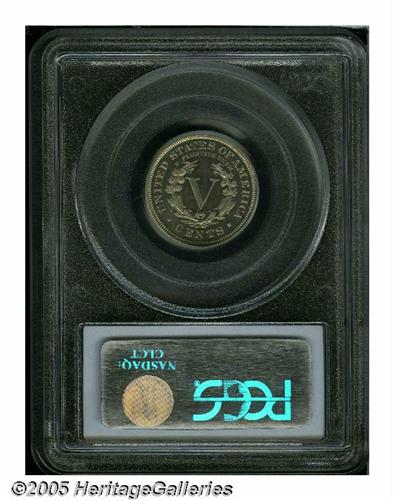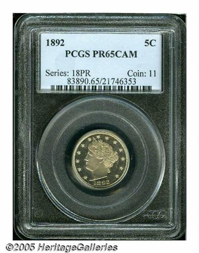 <B>1892<5C> PR65 Cameo PCGS.</B></I> Fully struck with frosty, beautifully reflective surfaces overlaid in milky golden-gray patina. The cameo contrast is more noticeable on the obverse. Population: 11 in 65 Cameo, 10 finer (3/05).
