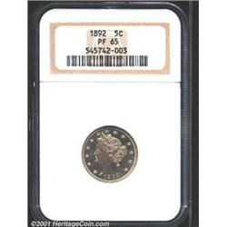 1892 5C PR65 NGC. Bright gold patina covers most of the sharply struck surfaces. There is a tiny lamination (as struck) in the left side of the denomination. The obverse is especially well preserved. Important notice: We expect to be auctioning lots at the rate of 200-250 per hour. Sometimes eBay Premier live bid software cannot keep up with that pace, so we strongly recommend that you place a realistic proxy bid now as insurance to avoid disappointment. Also please note that all Heritage/CAA lots purchased through eBay Premier carry a 20% Buyer's Premium.