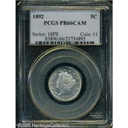 <B>1892 5C PR66 Cameo PCGS.</B></I> This needle-sharp and carefully preserved specimen offers wisps of delicate chestnut color. Elusive with cameo contrast. Population: 10 in 66, 0 finer (1/05). Lot:5920