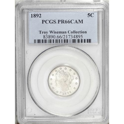 <B>1892<5C> PR66 Cameo PCGS.</B></I> This needle-sharp and carefully preserved specimen offers wisps of delicate chestnut color. Elusive with cameo contrast. Population: 13 in 66 Cameo, 0 finer (7/06).<BR><I>From The Troy Wiseman Collection.</B></I>