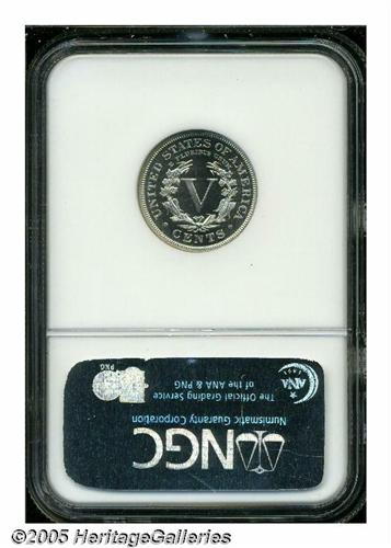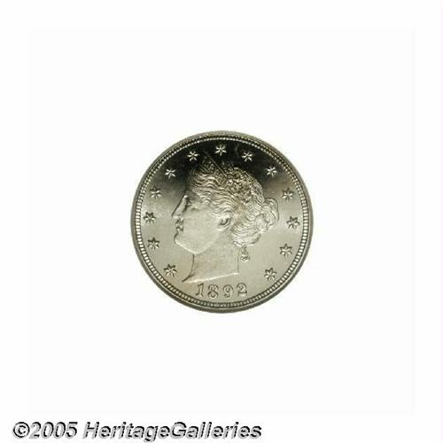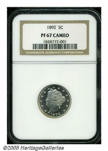 <B>1892<5C> PR67 Cameo NGC.</B></I> Fully brilliant and essentially as made, with an enviable degree of contrast between the fields and the devices. For those assembling a set of proof Liberty Nickels, here's an 1892 that should never require upgrading. Population: 5 in 67, 0 finer (5/05).