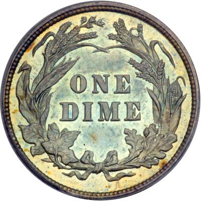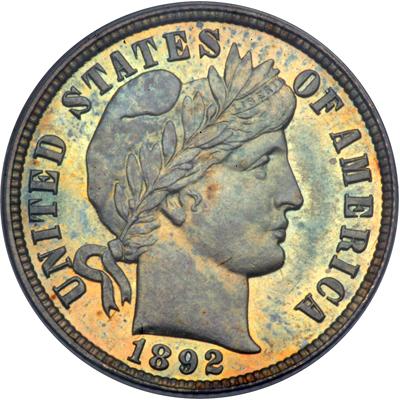 1892 Barber Dime. PCGS graded Proof 67. Lovely blue toning on both sides. Only 1,245 proofs struck. An untoned Superb Gem with excellent luster and surfaces that are free from even the tiny luster grazes. Struck with meticulous care by the dies, thereby confirming the Superb grade which PCGS has assigned. Mintage in 1892 increased somewhat with the introduction of the new Barber design. Perhaps 300 to 400 more Proofs were sold that would have been the case, but by 1893, levels returned to normal once the novelty had worn off. Pop 11; none finer at PCGS. (PCGS # 4875).