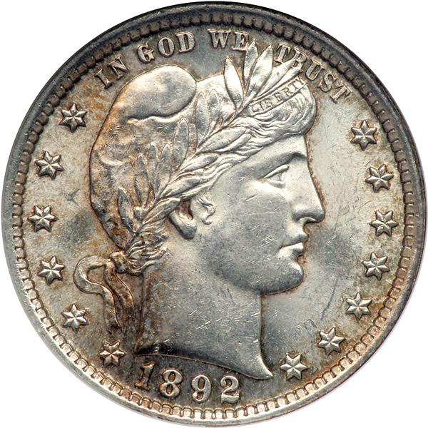 1892 Barber Quarter Dollar. NGC graded AU-58. Frosty and mostly untoned. A choice first-year specimen.