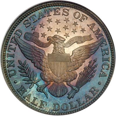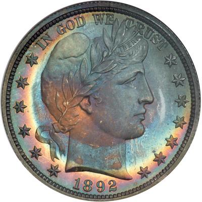 1892 Barber Half Dollar. NGC graded Proof 68. Lovely rainbow toning. Only 1,245 proofs issued. Utterly charming toning over both sides, delicate to deep levels of color saturation. Frosted devices. A lovely specimen, one of the very finest seen, of the first mintage Proof half dollar in the Barber series (1892-1915).