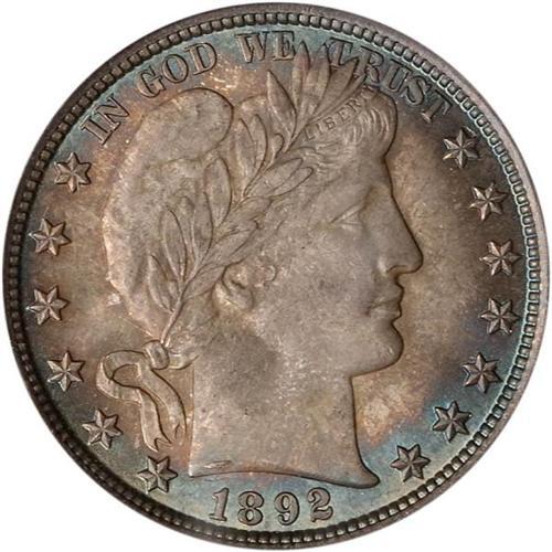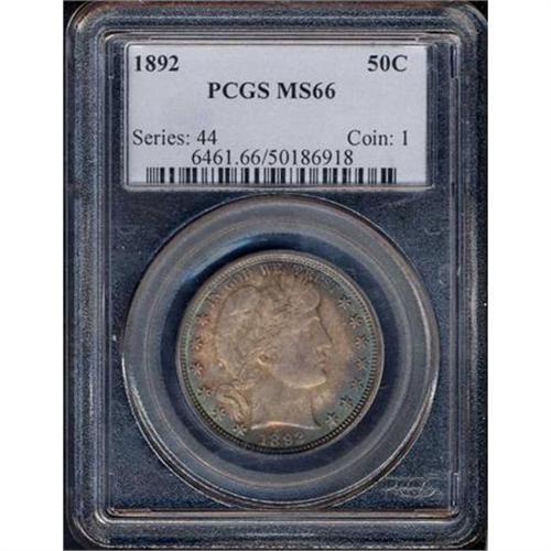 <b>1892 Barber Half Dollar. PCGS graded MS66.</b> An impressive gem of the first year Barber design with rolling luster forcing its way out from a blanket of lively rose and golden toning with wonderful steel blue highlights at the rim (the reverse is more universally blue in color). Representative strike for the date, meaning that we find nothing objectionable to describe on Liberty or the eagle. Nearly superb, in fact, where subjective quality is concerned! <b>(PCGS # 6461)</b>