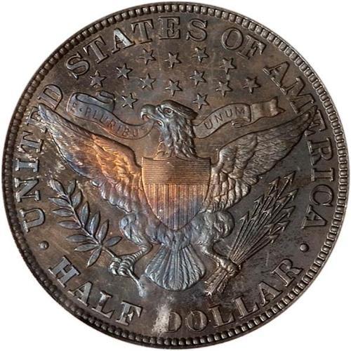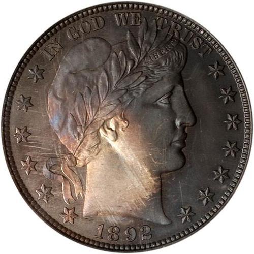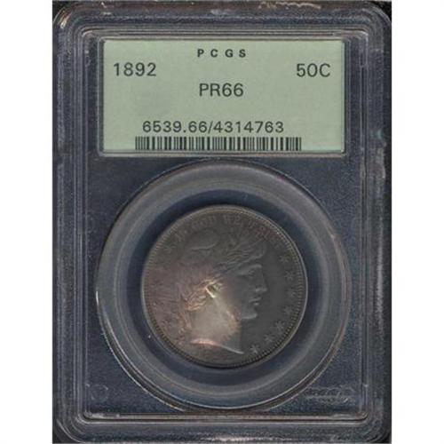 <b>1892 Barber Half Dollar. PCGS graded Proof 66.</b> Deep spotlight toned specimen. A glistening beauty and a gem by any standards. An engaging display of lively mirror reflection and satin frost for the devices leaps across the generations of color to excite the 21st century collector. The surfaces of this scarce Philadelphia Mint Proof are pristine. The strike too is strong for the date, razor-sharp in all locations including stars. Only 1,245 Proofs minted, which is an increase over 1891 due to the introduction of the new designs that sparked greater demand <b>(PCGS # 6539)</b> <i>