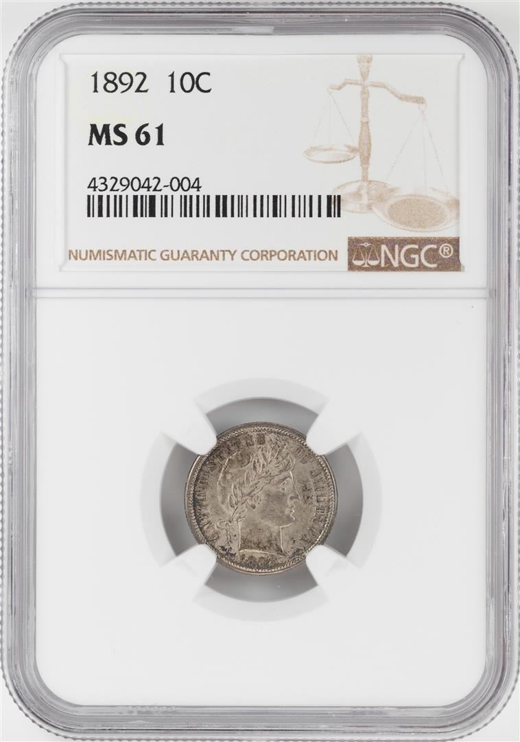 One 1892 Barber Dime Coin NGC MS61. NGC Certified.