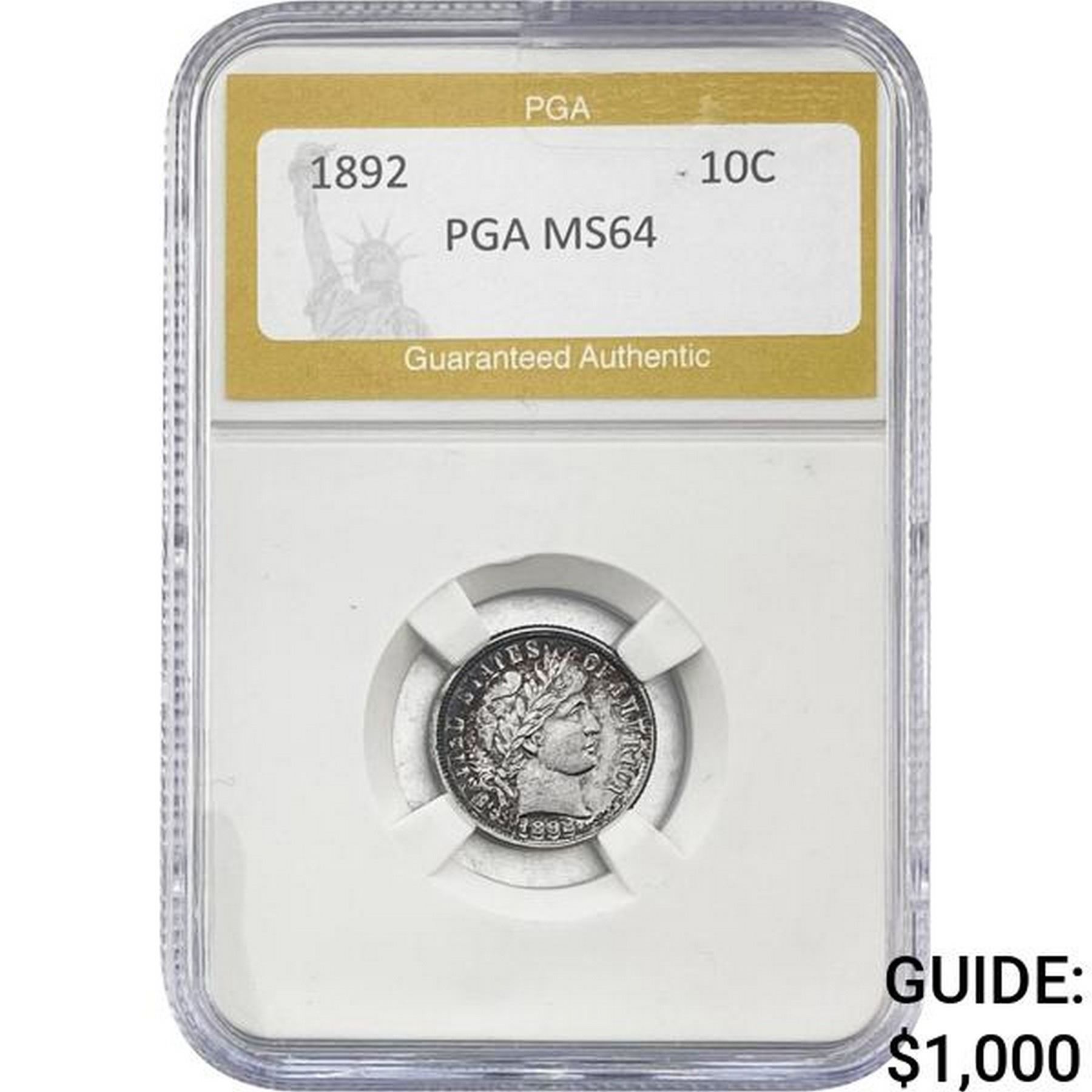 1892 Barber Dime PGA MS64
