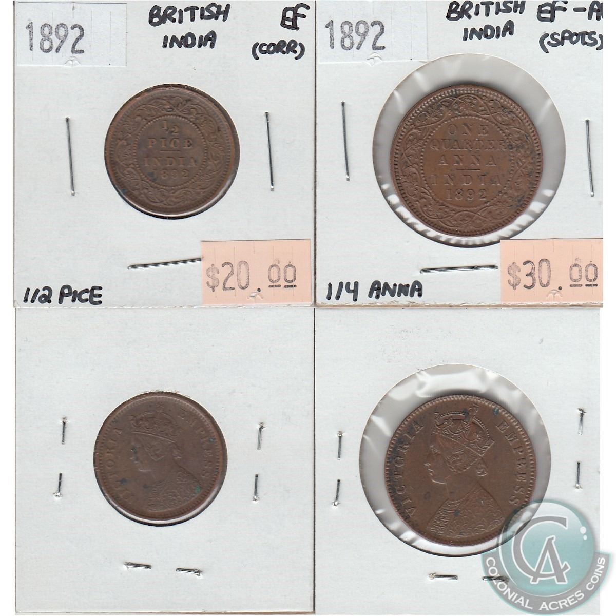 1892 British India 1/2 Pice in EF (corrosion) & 1892 British India 1/4 Anna in EF-AU (Spots). 2pcs