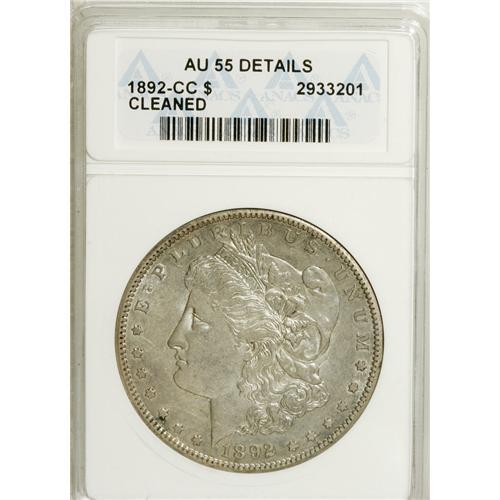 <B>1892-CC $1 --Cleaned--ANACS. AU55 Details.</B></I> NGC Census: (67/2846). PCGS Population (92/5052). Mintage: 1,352,000. Numismedia Wsl. Price for NGC/PCGS coin in AU55: $540. (#7214)<BR><BR><b>Shipping:</b> Coins & Currency (<a target="_blank" href="http://www.heritageauctions.com/common/shipping.php">view shipping information</a>)