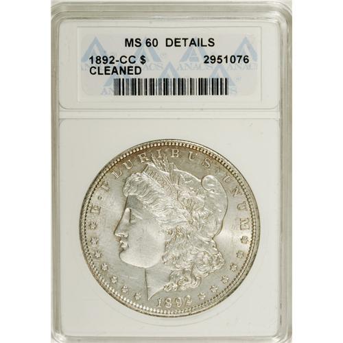 <B>1892-CC $1 --Cleaned--ANACS. MS60 Details.</B></I> NGC Census: (61/2651). PCGS Population (132/4849). Mintage: 1,352,000. Numismedia Wsl. Price: $900. (#7214)<BR><BR><b>Shipping:</b> Coins & Currency (<a target="_blank" href="http://www.heritageauctions.com/common/shipping.php">view shipping information</a>)